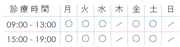 | 診療時間 | 月 | 火 | 水 | 木 | 金 | 土 | 日・祝 |